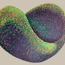 The patterns that make up these semi-abstract shapes, which despite seeming so grounded in appearance are always floating with space all around them, draw upon English 19th century textile designer William Morris’ Arts and Crafts influence on the home. The prints are reduction linoleum relief prints, in which the technique relies on the gradual removal of the block to overlay multiple colours. Browne’s sculptural approach to printmaking involves manipulating the viscosity of ink and registration to create flux within the colourful foliage, leaving evidence of the hand and a nod to the folklore of craft.