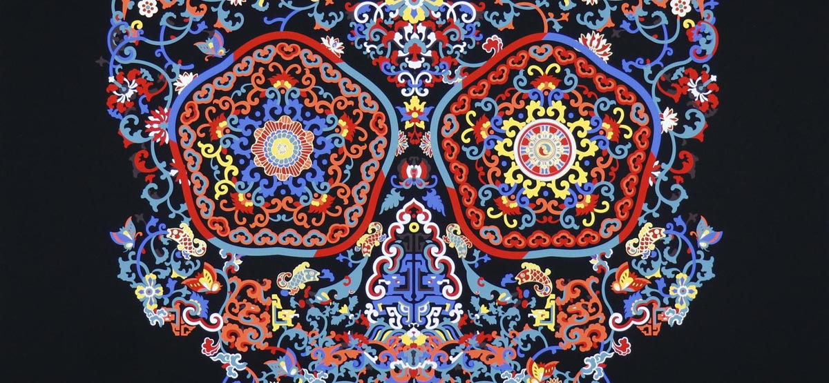 In Tsai’s rendition of cloisonné it reflects the beautiful patterns and typical Eastern motifs of flowers, koi fish and butterflies seen in traditional ceramics. The bold, flat colours reference the areas of enamel inlay seen in the cloisonné technique, but also replicate the vibrant immediacy of Western Pop Art. While this image of a single - somewhat intimidating - skull floating against a flat background has been seen in previous works by Tsai, he explores a new way of interpreting this image in