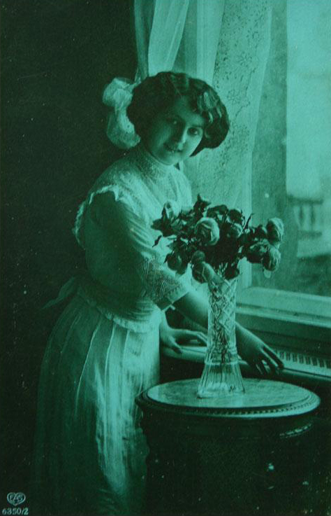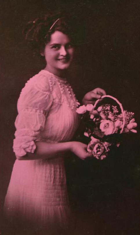 Each featuring a different lady in Victorian attire posing for the camera, the images are intriguing as we wonder who these young women were, where they lived and what their lives were like. Something interesting here is that while four of the images appear to be straight photographs of a solitude female posing with flowers, presumably to increase the ‘femininity’ of the image,