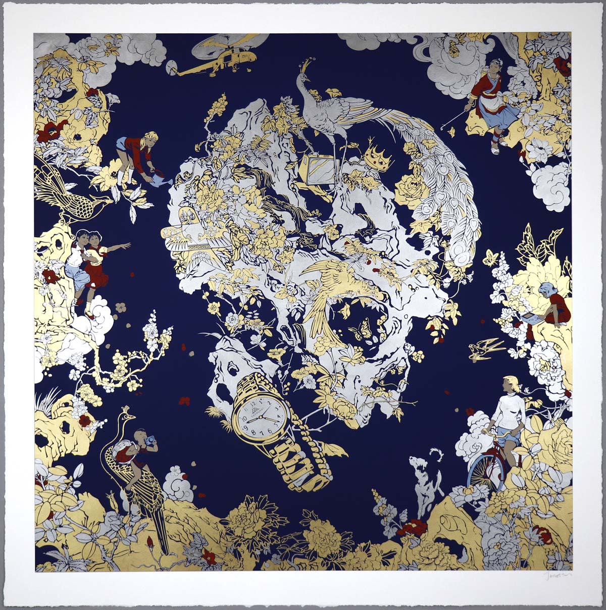 Like the fictional, amorous encounter of a young couple in a rear part of a deserted garden, Jacky Tsai uncovers his own daydreams. Rock formations, blossoming peonies and flamboyant peacocks set the scene from a sixteenth-century novel; and a kite, a bike and a polaroid camera - highlighted by gold and palladium - weave in his childhood memories. Without hesitation the artist delivers a wonderful piece of Eastern heritage and personal Western influences. Dream in the Deserted Garden celebrates the tenth anniversary of his ‘floral skull’ as well as being a tribute to his beginnings in Shanghai. Two works, one in vermilion-red as the daydream appears and a dark-blue version as it slowly fades and return to reality.