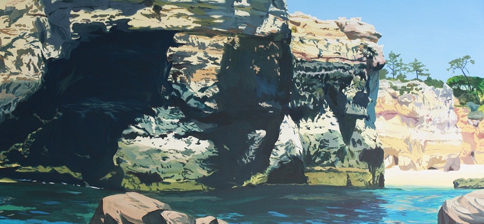 There’s something very fresh and new about Jonathan Purday’s most recent series of paintings. Continuing to focus on landscapes he’s experienced, both in the Algarve area of Portugal where he spent some time living in recent years and in Cornwall in the UK where he visited last summer, these new canvases are more complex and accomplished than previous works, almost as if Purday has ‘found his feet’ so speak with his subject matter and matured into his style of working.
