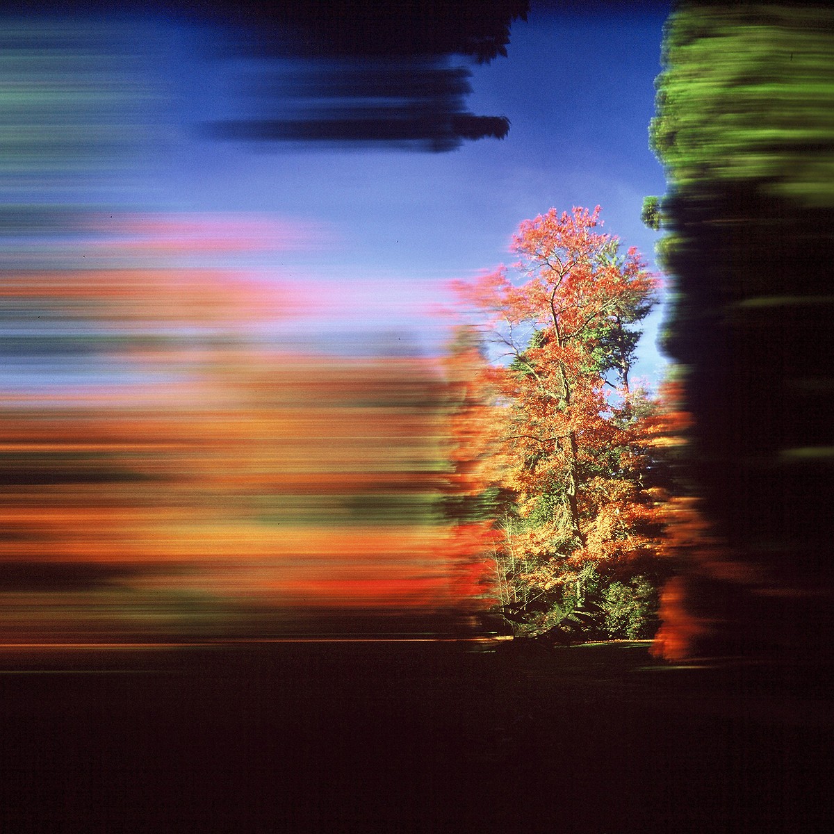 Rob Carter's photographs play with senses of perception. Transfixing horizontal lines of colour, like rock strata or layers of the atmosphere, give the illusion of a moving image, as if taken from the side window of a driving vehicle. They are in fact stills, taken using a revolving-lens camera that stretch the 'moment' both literally - in that the camera shutter is held open - and visually, as the details of the subject blur out horizontally.